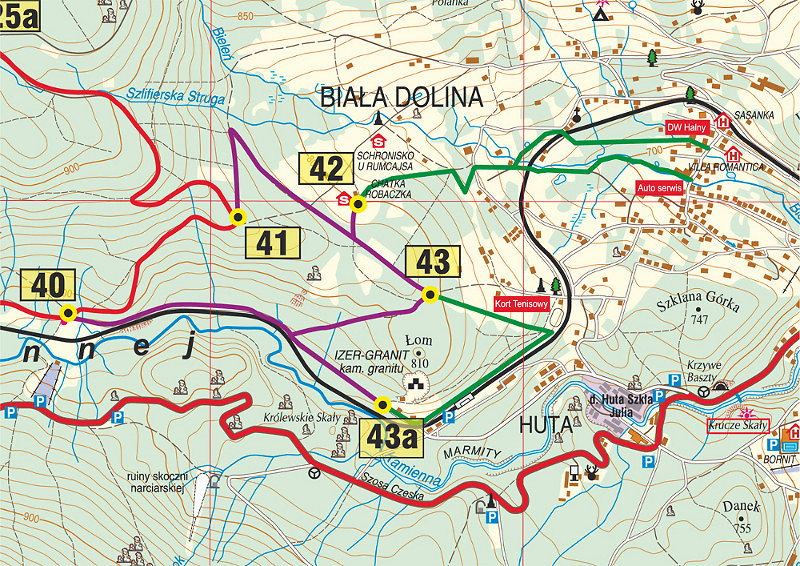 Przedstawiona powyżej mapka ukazuje wyznaczone trasy biegowe. Zaznaczone kolorem zielonym trasy biegowe utrzymywane będą w okresie ferii zimowych przez Lokalna Organizację Turystyczną. Trasy prowadzą przez stary Park Zdrojowy od DW "Halny" i Centrum Motoryzacyjne oraz od dworca Huty do Chatki Robaczka ( pkt. 42 i 43).